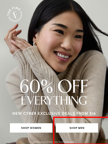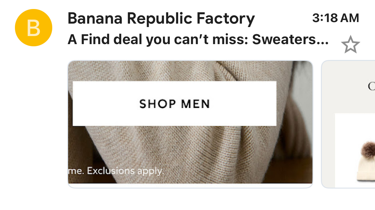 It is a big beautiful first image. But the SHOP MEN section of the image is what Gmail grabs. That is the section of the image that fits Gmail’s preview and delivered in the carousel. If Banana Republic wanted the hero image first that designing the image in a 4:5 dimensions could have offered the hero image.