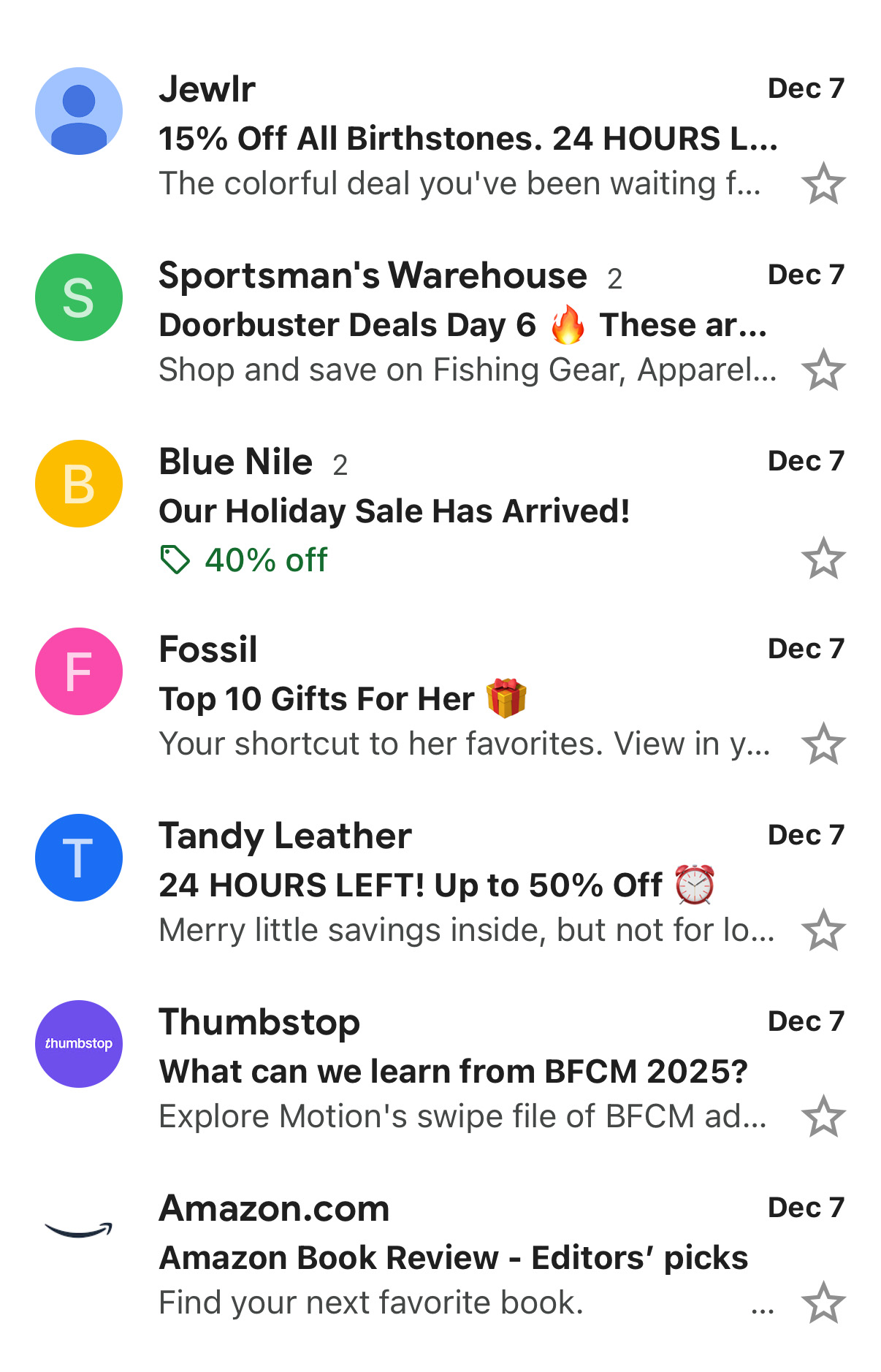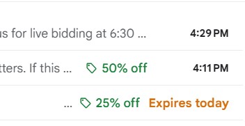 Below is an example of the inbox. As you can see, the discount on Blue Nile stands out. Now the offer on the green catches the eye and offers users something a little extra in the email box.